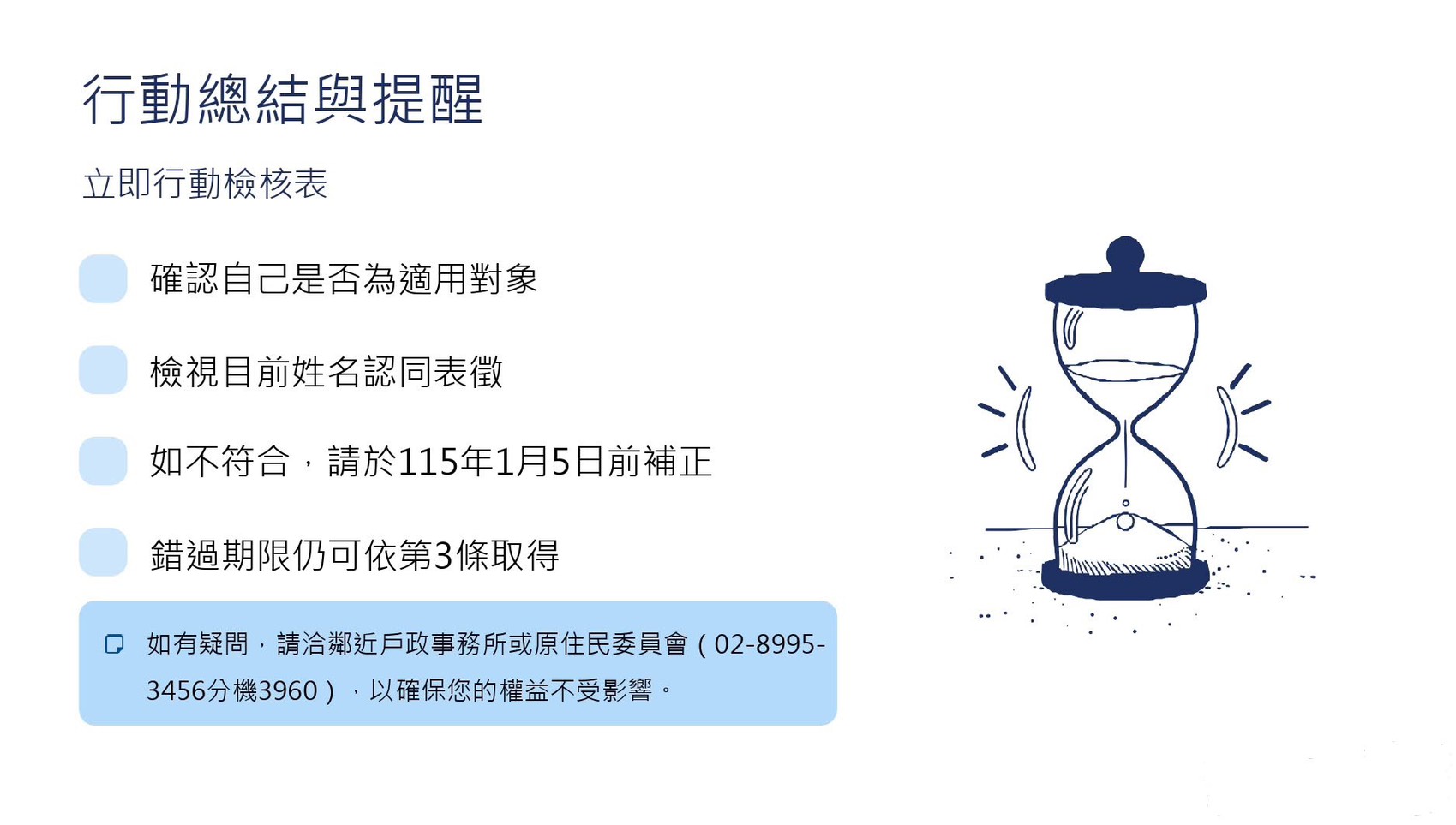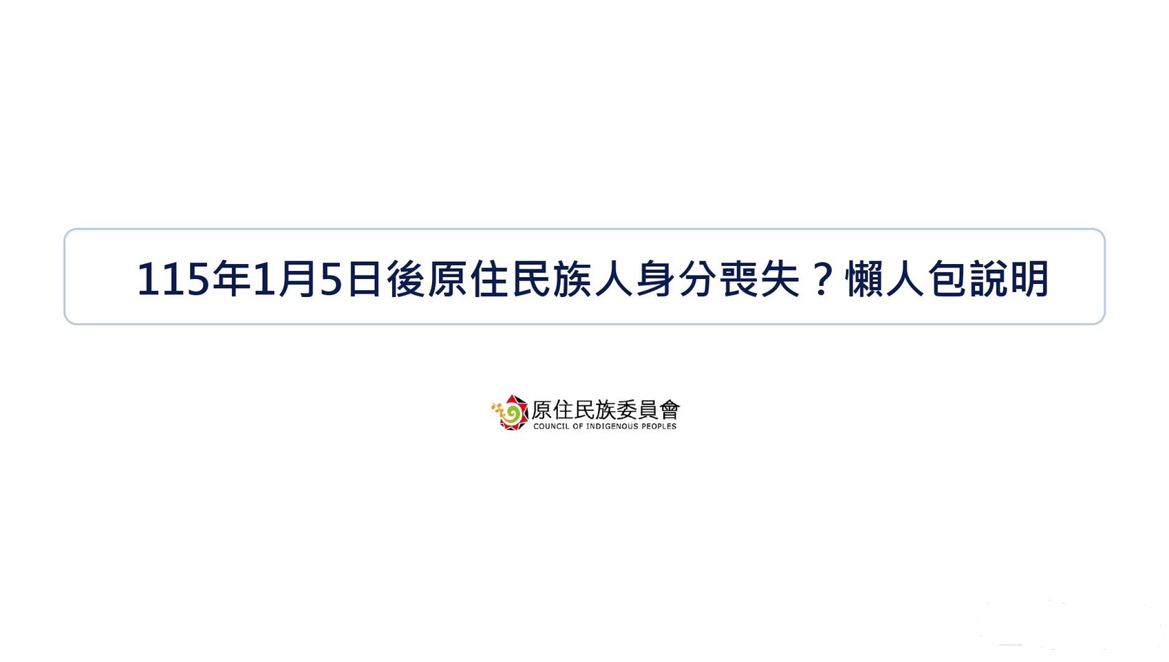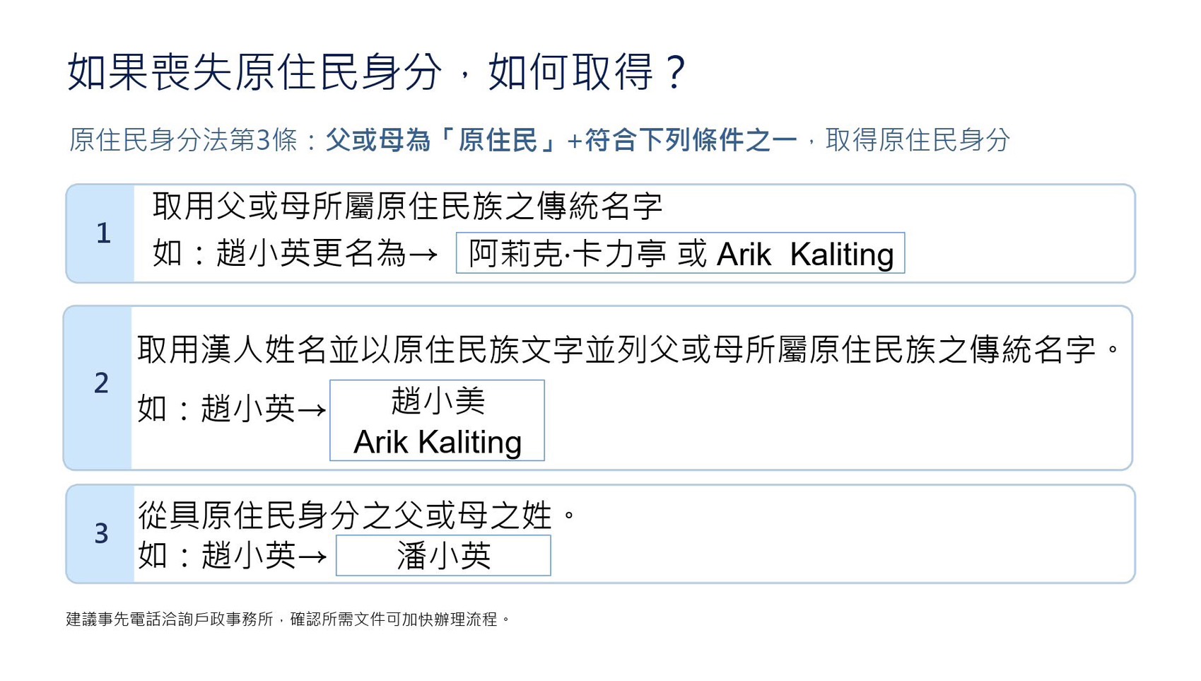 原民會最後表示,族人如有疑問,可就近洽詢戶政事務所,或電洽該會業務單位諮詢專線(電話:02-8995-3456分機3690、3062、3077)。