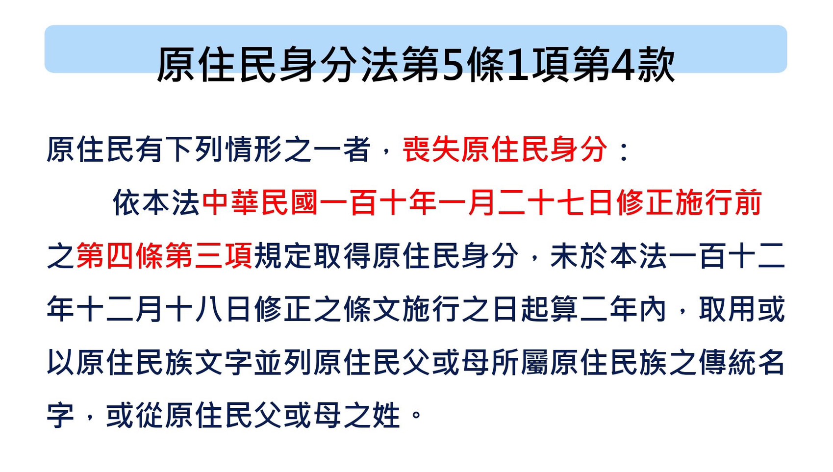 原民會(23日)提醒依照110年1月27日修正前原住民身分法第4條第3項規定取得原住民身分之部分族人,在明年1月5日前儘速取用或並列原住民族傳統名字或從具原住民身分之父或母之姓,以免喪失原住民身分。原民會補充說明:「依照戶籍法相關規定,經過法定期間及書面通知仍未辦理者,才會喪失原住民身分,即便身分喪失仍可重新申請。」