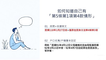 戶政事務所表示,特殊情況之認定請直接電洽原民會業務單位諮詢專線(電話:02-8995-3456分機3690、3062、3077),方可得到最正確的答案喔。