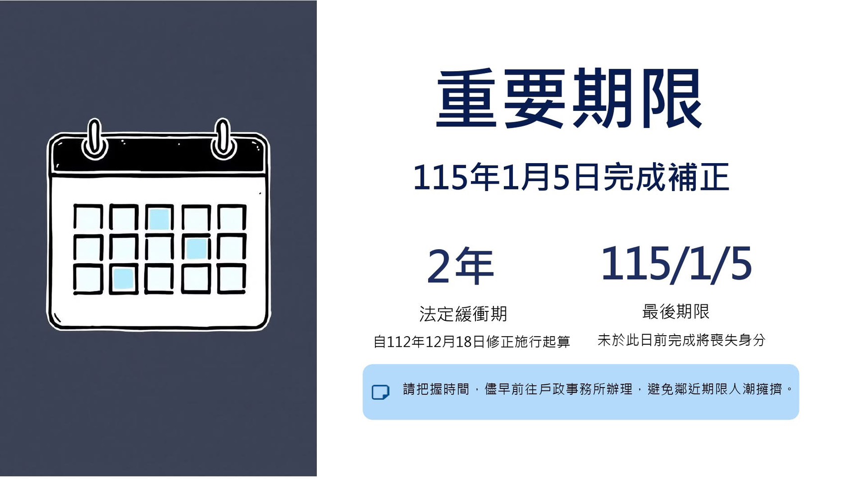 原民會指出,依照戶籍法第48條規定,明年1月5日起的30日內仍可申請補辦,逾期仍未辦理,戶政事務所會書面通知個別族人在一定期限內辦理。如果經過前面程序仍未辦理者,戶政事務所才會依照戶籍法第48條之2規定逕行廢止原住民身分。