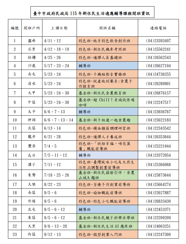 臺中市政府民政局115年度新住民生活適應輔導課程開班資訊,